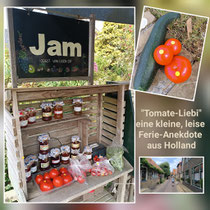 Scho vo wyttem häi si hellrot glüüchtet. Okay lüüchten isch villicht biz übertriibe, aber me het die Tomaten uf däm Holzregal scho guet gsee. Si sy in däm dunkel beizte Regal vorme Gartehaag schön uftrapiert gläge. Oobe sy Gumfigleeser gstande, alli mit Stoffdeckel, so lyycht vergilbti, farbigi Stöffli mit nautische Mootiv druff, liebevoll mit ere zaggede Scheer usgschnitte. Uf däm Regal hets es Schild gha, wo mit ufgmoolter Schrift gross JAM gstanden isch und drunter "Oogst van eigen Erf" - Ernte vom eigenen Hof uf Holländisch. Zig Gumfigleeser sy so ufgräit gsi, alli uf holländisch mit em Vermerk Texel aagschriibe. Uf deeren Inslen ime Dörfli isch das Regal gstande, unden innen ebe die Tomate. Uf jeederen isch es chlyses, orangschs Pryys-Chlääberli druf kläbt mit Pryyse vo 70 Cent bis 1.20 Euro.